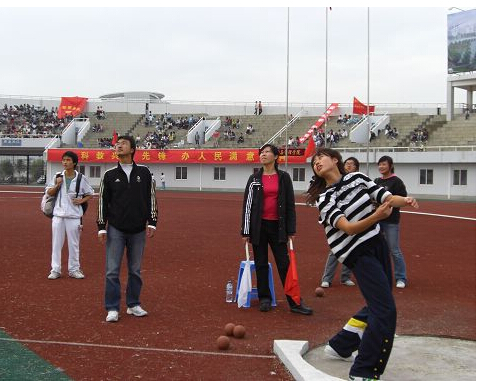 投掷圈用厚0.6cm铁板、钢板或其它材料围成直径2.135m的圆圈,漆成白色。