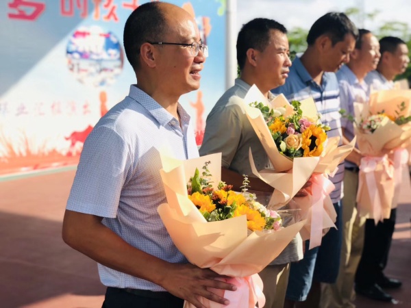 清晨,冷清的街道和胜龙小学热闹的校园形成了强烈的对比。一踏入校园,就有同学亲热地围上来,拉着你的手,甜甜地送上:“老师,祝你节日快乐!”的祝福;迎面而来的同学也将往日的“老师,早上好!”改成了“老师,节日快乐!”。利用课间操时间,学校举行了简单而隆重的“师恩难忘 感谢有你”庆祝教师节主题教育活动。在冼学峰校长热情洋溢的致辞后,全体教师逐一登台亮相,接受家委和学生代表们为老师们送上了鲜花与祝福。每位老师的脸上都挂着幸福的笑容和满足!纷纷表示:“当老师,真幸福!”。