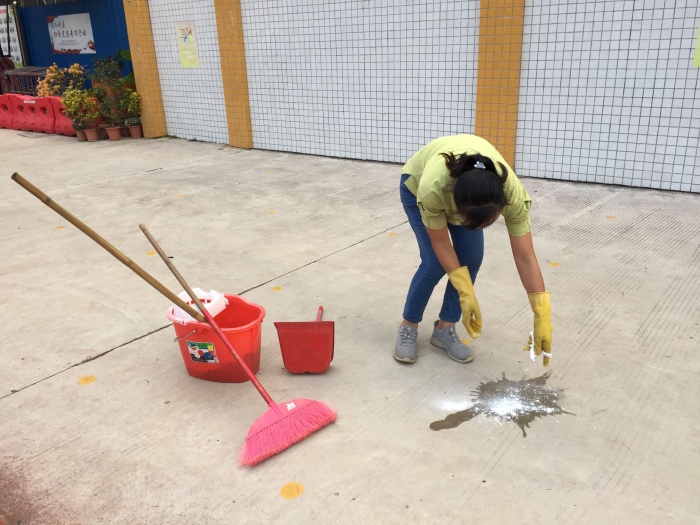 本次应急演练的是模拟放学途中学生突发呕吐场景演练。4:25放学铃声响,二(1)班队伍走到校道中间位置,有一位学生不舒服(由学生扮演)突然出现“呕吐”,吐到满地都是“呕吐物”,班主任姚老师马上戴上口罩,有序组织周围学生马上撤离开,并让学生立即戴上口罩,撤离现场。随后,安排“呕吐学生”原地用纸巾清洁嘴巴后戴上口罩,带学生到隔离区,向学生进一步了解身体情况和近期去向、接触史等。