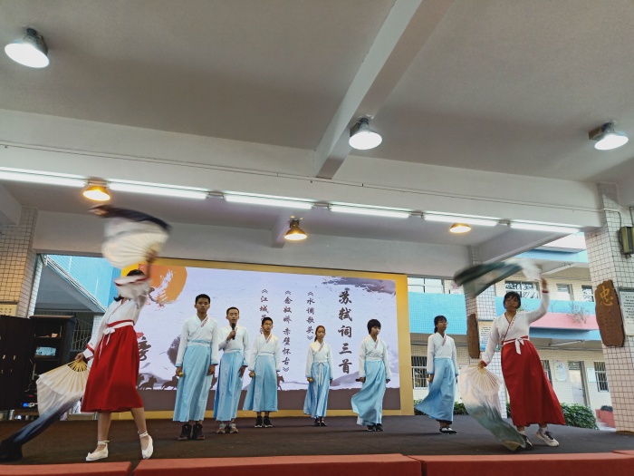 《李白诗二首》让大家似乎感受到了那光辉耀眼的盛唐气象。《木兰辞》的表演者采用了情境朗诵的新形式,既向观众呈现了一个英姿飒爽的少年将军形象,又向观众展示了一位楚楚动人的闺中女红装。《水调歌头》的传唱,让经典与现代交汇,仿佛踏歌而去,与苏轼共赏那一轮孤月。一(9)班学子用铿锵有力的声音,道出了梁启超《少年中国说》的壮志豪情,鼓舞着现场的每一位少年!