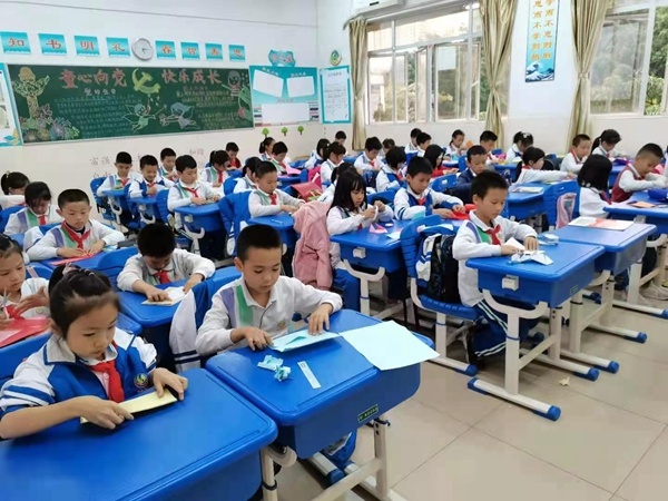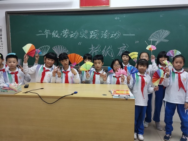 制作的过程中,同学们手脚麻利,不论是柔软的彩绳还是七彩的卡纸,使用起来都得心应手,动手能力令人惊叹。偶尔还有构思巧妙的作品产生,引得教室里欢笑一片。经过十几分钟的精耕细作,作品新鲜出炉。二年级五彩的纸扇,映着同学们灿烂的笑容;一年级同学的小鱼仿佛要在他们的手中游弋;三年级同学的纸鹤捧在掌心,视若珍宝。四五年级的同学则早已把精心制作的手链和挂件戴在了身边,爱不释手,喜不自胜。