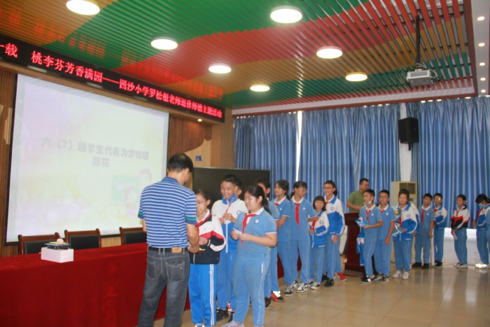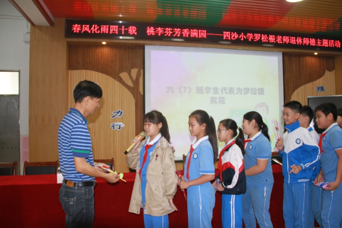 在经久不息的掌声中,四沙小学校长欧慧芳向罗松根老师赠送了上书“春风化雨四十载 桃李芬芳香满园”的锦旗,表达了对罗松根老师为人民的教育事业所作出的巨大贡献的充分肯定。罗老师也上台作了发言。他希望全体同学听老师的话,好好学习,天天向上,长大后做一个对社会有用的人。