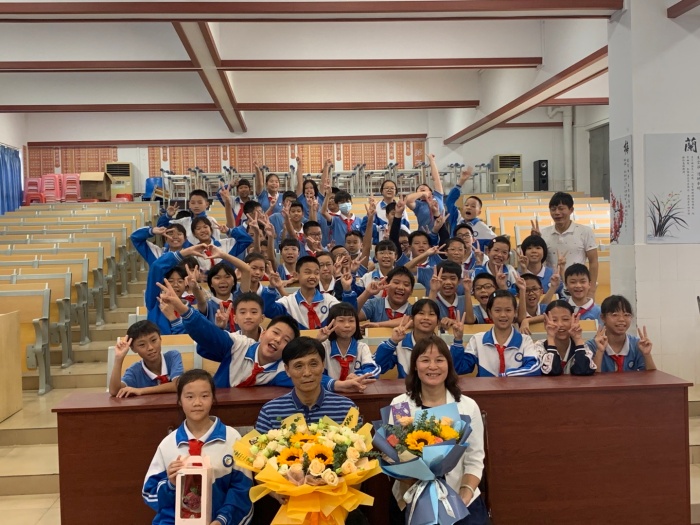 罗松根老师的发言激发了学生们的尊师热情。同学们纷纷走上前,把自己亲手制作的鲜花、卡片等小礼物和最美好的祝福敬献给罗松根老师,祝愿他老有所乐,身体健康,家庭幸福!
