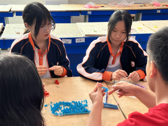 手工串珠的热潮并没有就此停止,各班代表回到班级,在班级里进行演示教学,同学们跃跃欲试,纷纷开始照着教程认真编了起来。大家用一根长鱼线灵活地穿梭于五颜六色的珠子中,遇到不懂的地方,大家就一起探讨,相互学习,现场欢笑声一片。