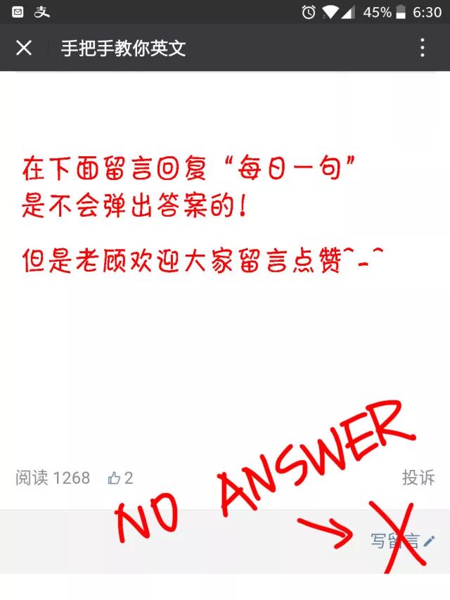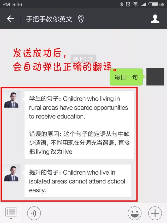 每日一句,老顾设计。 记住你开始的一天,看自己第几天通过雅思。 政府需要将钱放在体育设施的建筑上。 获得答案的方法 后台发送“每日一句”四个字,就会自动弹出错例讲解和正确翻译。 新的“每日一句”出来以后,答案就会更新,前一天的答案就查不到了。记得做笔记哦~ 下面是图解方法。 把图片向左滑动查看更多步骤。 每天都在练习的学霸们 给老顾点个赞~