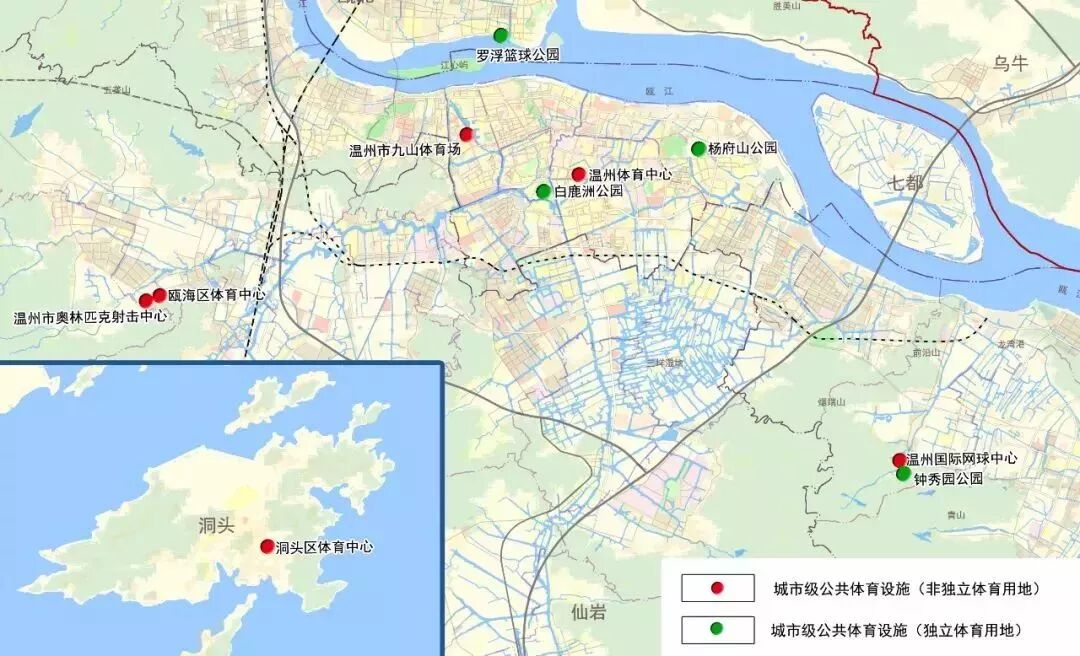 在规划区公共体育设施布局上,针对城市级公共体育设施我市计划形成多层次的城市级公共体育设施布局。并结合温州山水地域特色和“两线三片”城市建设重点,规划建设环山(大罗山、景山、吹台山)登山步道、环河(温瑞塘河)沿江(瓯江两岸)健身走廊(自行车道+健身步道+跑步道)。