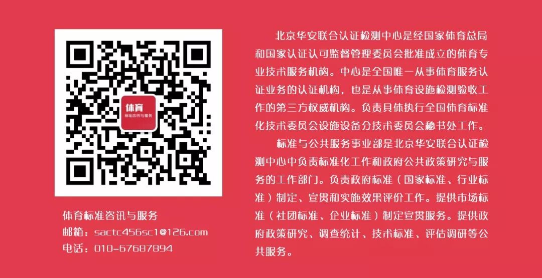 北京华安联合认证检测中心标准与公共服务事业部至今已组织制定完成20余项国家标准、行业标准,标准广泛应用于体育设施建设和设备制造领域的咨询、设计、施工等各个方面。我们致力于向有标准化需求的体育社团、企业及个人提供标准编制、管理服务和标准化技术咨询等服务。咨询电话010-67687894。