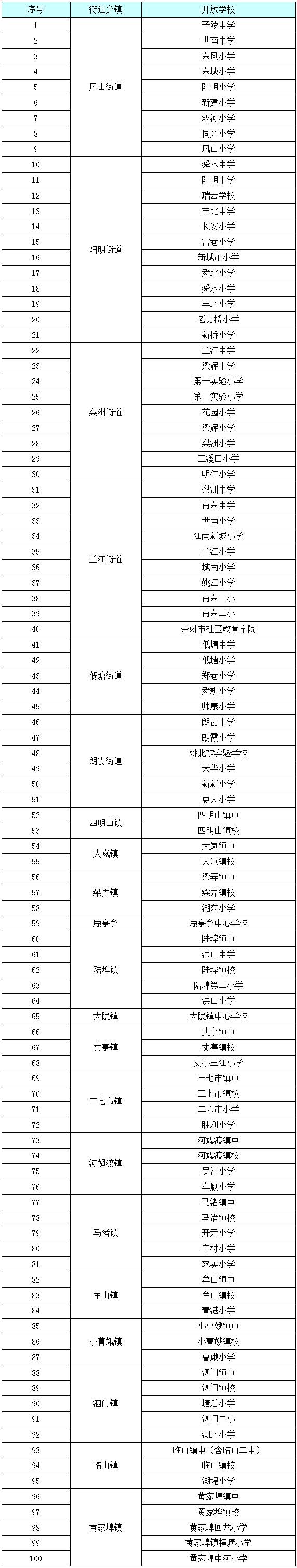 根据余党办﹝2009﹞45号《关于印发余姚市学校体育资源向社会开放的实施意见》和余政办﹝2016﹞32号《余姚市人民政府办公室关于进一步做好学校体育设施向社会开放工作的通知》的文件精神,要求2017年始义务段所有符合开放条件学校的体育资源向社会开放。