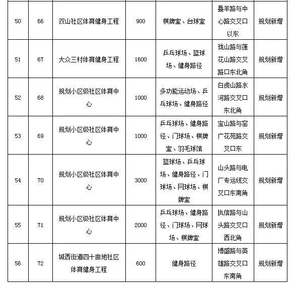 居住小区级体育设施体育56处,体育设施用地面积6.91hm2,其中,现状保留23处,改扩建19处,规划新增14处。规划该级体育设施采取定量不定位的规划控制。