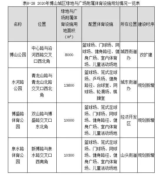 规划到2020年,博山城区单位附属体育设施开具备开放条件的32个,规划开放17个,开放率达53.1%,体育设施用地面积41.43hm2。