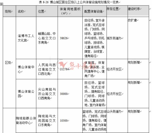 区级公共体育设施3处,体育用地面积28.14hm2。改扩建1处,即淄博市工人文化宫;规划新增2处,分别是博山区体育中心和博山体育公园。