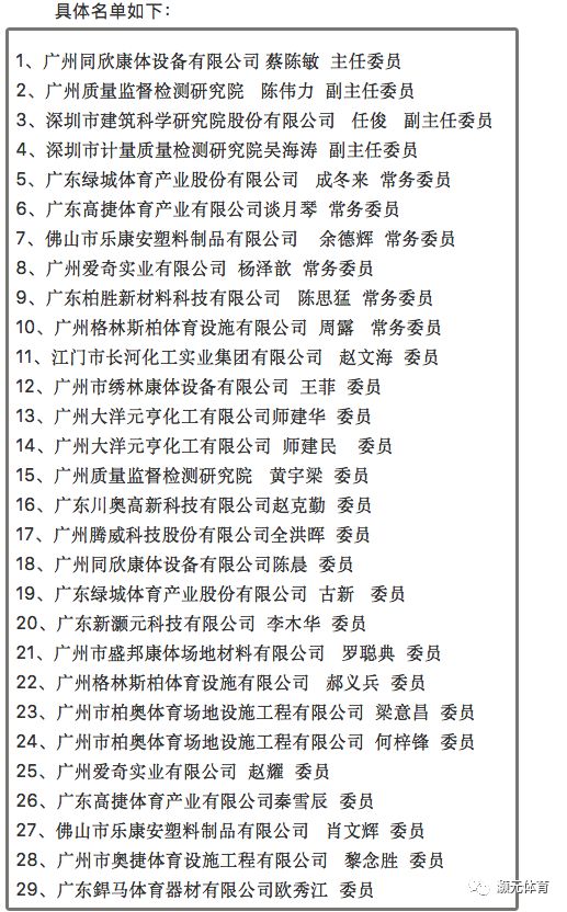 为了加强协会配合广州质量监督检测研究院、深圳计量院和深圳建科院(以下简称“三院”))对行业市场服务及监督的职能作用,2018年4月9日经GSM协会常务理事会研究决定,由常务理事会发起单位,成立体育运动场地专业委员会,有秘书处整理了成立”技术专业委员会“工作任务,在三院的积极引导支持下,协会常务理事会一致表决通过,正式成立体育运动场地专业委员会,经各单位推荐,委员会筹备小组研究后产生第一届广东省体育设施制造商协会体育运动场地技术专业委员会委员名单,其中主任委员1名,副主任委员3名,常务委员6名,包括灏元体育李木华在内的委员19名 。