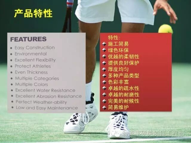 1、球场专用涂料,采用100%高级丙烯酸材料制成,无毒、无石棉,为环保型面层材料;
