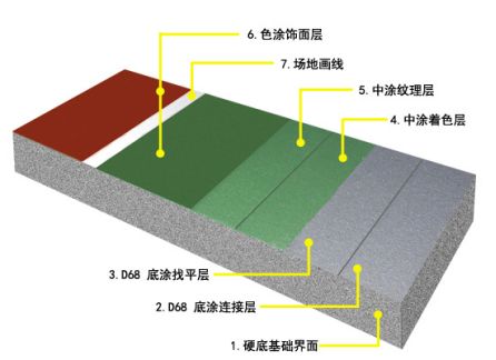 丙烯酸涂面系统,厚度约为1.5-2mm。内含百分百无机性纤维颜料,铺设在已冲洗干净值良好及排水斜度(1:100至1:150之内)的水泥或沥青地面基础上。