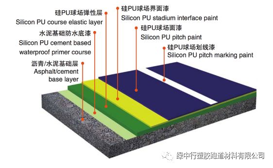 面 层:水性环保,符合健康运动主题。加有机硅改性更耐磨易着色,色彩多样。