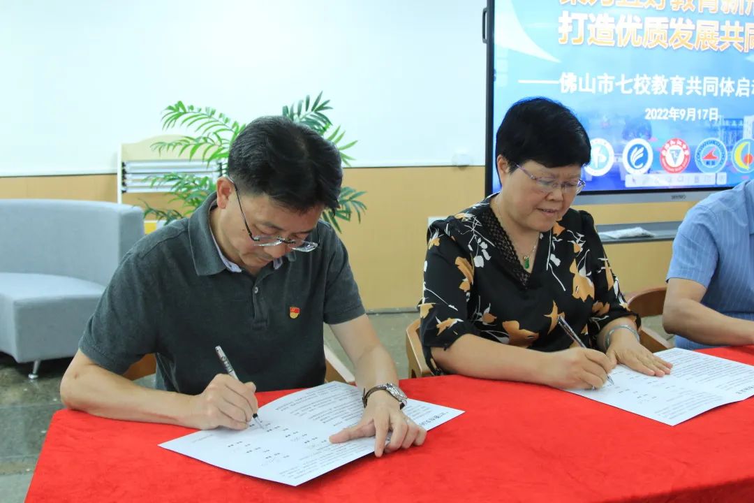 2022年9月14日,我校与高明区第一中学 、南海区第一中学、南海区九江中学、佛山市第四中学、顺德区乐从中学、顺德区罗定邦中学共七所优质高中的校长及市、区两级教研部门的领导齐聚顺德罗定邦中学,参与以“聚力五好教育新形态 打造品牌发展共同体”为主题的佛山市七校教育共同体启动仪式。 新一轮高考改革中,七所学校发展势头迅猛,共同体打造将实现资源共享、优势互补,助力学校更好更快地发展。本次共同体是在佛山市教研室的指导下成立的,打破地域的隔阂和校际的壁垒,七校互学同进,为佛山优质教育贡献力量。佛山市教研室彭海燕主任表示希望“共同体”各学校应依托平台资源,开展教学、教研、活动等多方面的合作,举办“共同体开放日”“高三备考交流”“共同体联合命题和测试”等具体活动。佛山市教研室王怀文副主任、顺德区教育发展中心王涛主任、林俊才副书记及共同体学校校长先后发言,畅谈各自学校教育教学妙法,展望共同体的宏伟蓝图,大家激情洋溢地共话未来。 我校校长区淑玲在会上发言 我校校长区淑玲在大会上与大家交流经验,畅谈设想、思路,区淑玲校长的发言求真务实,说实干,求实效,力求将共同体相关工作落到学校教育教学的日常中来。这是共同体教育人的底色,也是佛山教育的本色。 随后,在佛山市和顺德区两级教研部门的见证下,七所学校签署了协议,宣告佛山市首个高质量发展教育共同体正式成立。 共同体签约现场 区淑玲校长(右)代表容山中学进行签约 此后,七所学校携手共进,一起走向美好的未来。这是佛山教育人携手践行教育使命的必将选择,也必成为佛山教育界靓丽的风景。我校也将以此为契机,乘东风,砥奋进,争取教育质量再迈新台阶。