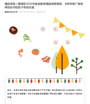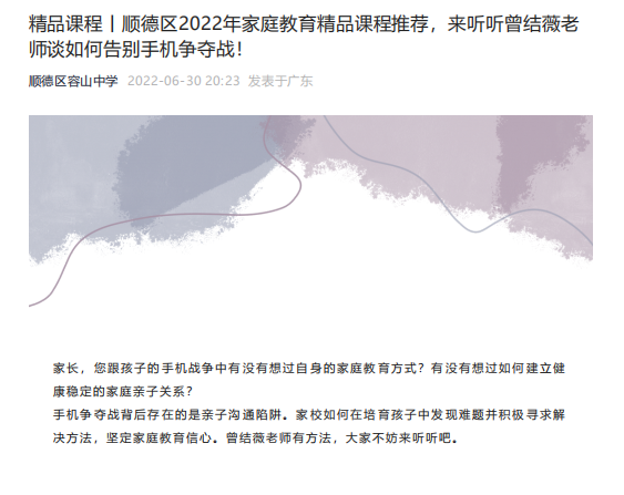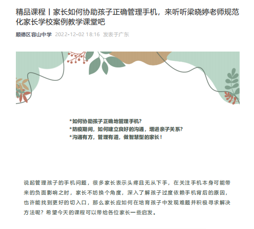 学校抓住市区开展精品课程及首届佛山家庭教育家等评选活动,狠抓质量,提高家庭教育精品课程意识,在多次打磨的基础上推出系列精品课程,如曾洁薇《告别亲子手机争夺战》、梁晓婷《家长如何协助孩子正确管理手机》、陈广颖《如何与孩子有效沟通》等精品课程,获得市区二三等奖奖项。