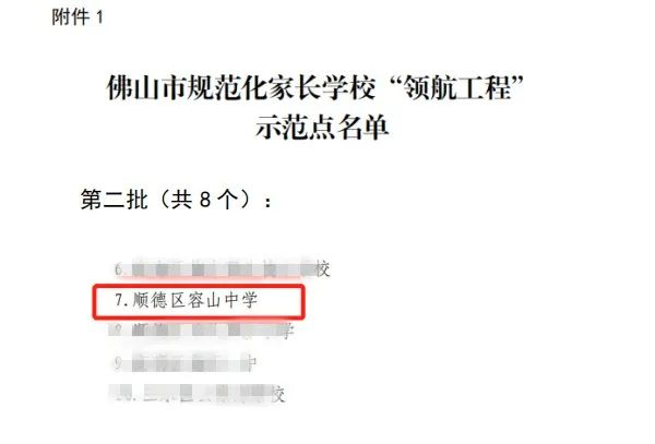 学校被评为佛山市教育局规范化家长学校“领航工程”第二批示范点。我校区淑玲、乐燕霞主持的家庭教育案例《以家校“小作坊”,见教育“大天地”》获广东省教育厅颁发的广东省中小学家庭教育“校(园)长开展家校协同育人”典型案例。