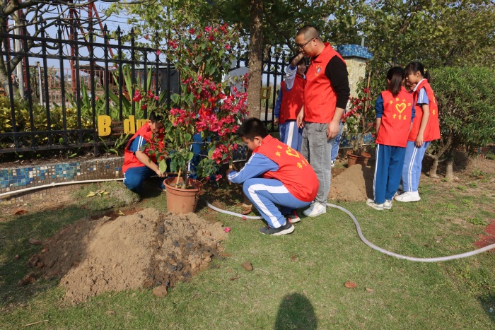 一锹土,播种的是生机;一桶水,浇灌的是希望。新联小学还以班级为单位,开展植树节的种植活动,本次种植的是“勒杜鹃”。活动前,各班召集家长在指定的班级位置挖好坑。活动伊始,新联小学大队辅导员黄菲菲首先向大家讲解植树的相关知识和注意事项。紧接着,孩子们在各班老师的带领下,拿着铁锹、水桶等工具,迅速投入到种植实践中,铲土、扶苗、培土,整个过程认真细致,井井有条,做到了劲往一处使,汗往一处流,大家都在用自己的劳动诠释着对大自然生命的关爱。种植完,各班级给幼苗挂上班级牌,并与之合影留念。一株株“勒杜鹃”苗木矗立在微风中,在明媚的阳光下更加显得生机勃勃。