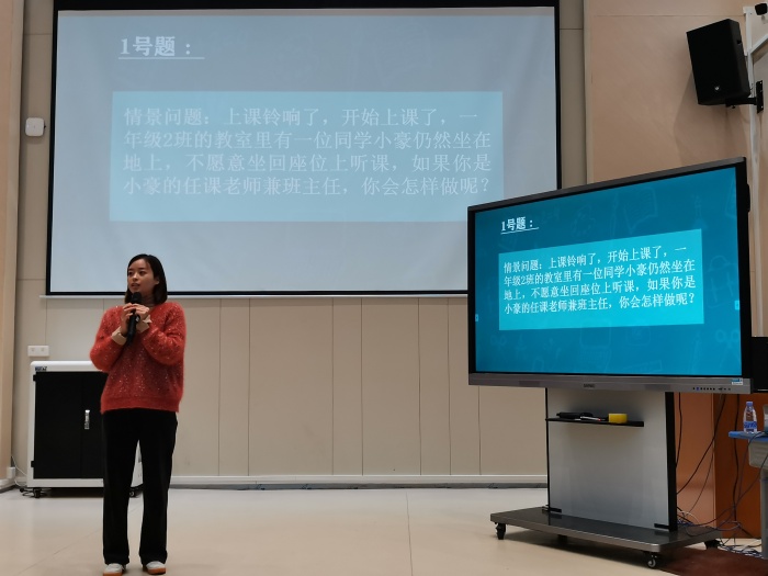 在“情景答辩”环节,参赛班主任们现场抽一个案例,然后运用现代教育理论、教育原则和心理学知识,进行分析并说出处理解决的办法。参赛班主任们分析条理清晰、思路创新、周到全面,紧扣主题、表达清楚,展现了极高的理论素养,以及很强的分析问题、处理问题的能力。