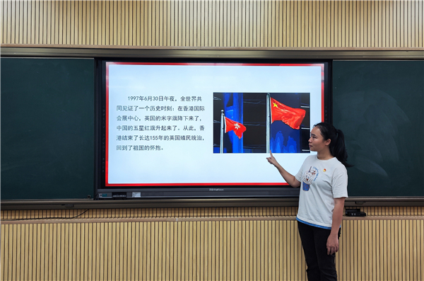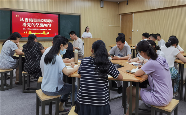 随后,王颖丽同志通过丰富的数据介绍了香港回归祖国以来所取得的举世瞩目的成就,并带领大家深入学习了习近平总书记在庆祝香港回归祖国25周年大会暨香港特别行政区第六届政府就职典礼上的重要讲话精神。她指出,香港回归25年的发展历程,充分证明了“一国两制”政策是香港保持长期繁荣稳定的最佳制度,更是党处理复杂国际问题和内政问题时的大智慧与战略定力的集中体现。香港回归25年的风雨历程同样是一堂生动形象的历史课和思政课,作为党员教师,我们要围绕立德树人根本任务,讲好“一国两制”成功实践的香港故事,引导学生厚植家国情怀,以史为鉴,开创未来。