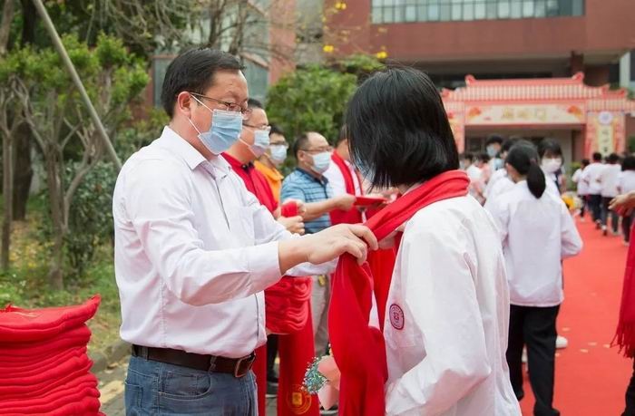 周锦泉校长,张旭副校长带领班主任为学生佩戴成人帽、颁发《中华人民共和国宪法》读本。成人是一种超越生命时间尺度的责任与担当。头戴成人帽,手捧《宪法》,这一刻他们已是肩负责任与使命的成人了,寓意着同学们要以共和国公民的身份去承担起法律赋予的权利和义务!同学们要用一往无前的勇气去面对高考,面对未来的人生。