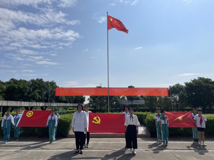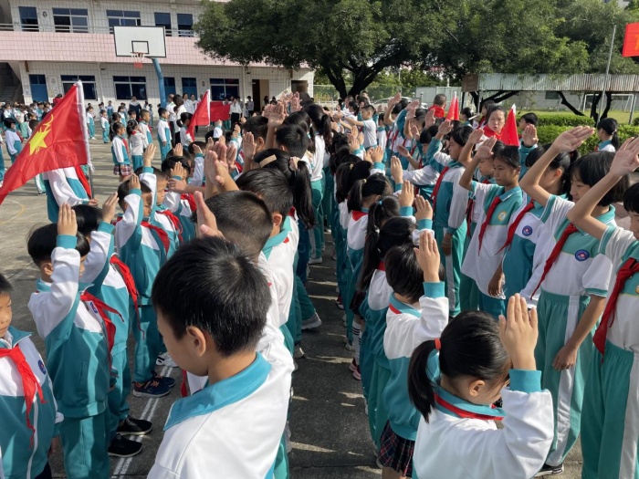 少先队员们在党支部书记詹前秒校长和少先队大队辅导员林素涵老师的带领下,在队旗下高举右拳,庄严宣誓,铿锵的誓言表达了他们在党的阳光沐浴下在星星火炬的照耀下,从小听党话、跟党走的坚定信心和决心。