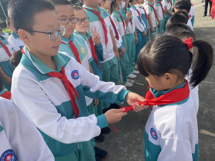 现场随着《出旗曲》激昂的旋律响起,少先队旗手和护旗手迈着整齐的步伐,精神抖擞地进行着庄严的出旗仪式。全体少先队员精神饱满齐声高唱《中国少年先锋队队歌》,振奋而富有力量,歌声响彻整个操场,同时老队员为新队员代表们佩戴了红领巾并互敬队礼,新队友们光荣地加入了中国少年先锋队。