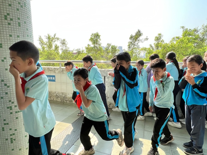 随着紧促的警报声响起,各班老师立刻停止教学工作,迅速组织孩子们捂住口鼻,弯腰低头,快速有序地从教室向操场安全地带疏散撤离。各班安全到达操场后,各班立即清点人数,确保每一位学生安全到达,演练达到了预期的目的和效果。