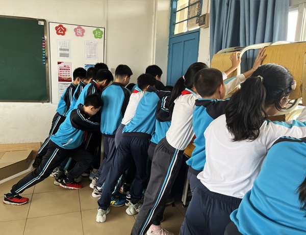 演练开始,师生们正在操场上开展大课间活动。这时,一名男子来到学校门口,大声吵闹。值班门卫迅速带着警棍上前劝阻,该男子不以为然,反而拿刀具强行闯进校门,另一门卫见状,立即报告校长并通过“一键紧急报警系统”向公安部门报警。校长接报后,马上指示梁森明主任联系杨琼威老师。紧接着,杨老师连忙利用广播通知师生校门口发生暴力事件,现启动学校防恐防暴应急预案,请学校护卫队以最快速度到达门口参加护校工作,协助撤离的老师快速到指定站点,各班主任组织学生有序、迅速撤离回课室。随即警报拉响,605名学生仅用了45秒便全部安全撤回到课室,当即开展了锁门关窗,用凳子、桌子抵住门窗等一系列的护班行动。此时,安全护卫队员与保安人员一起奋不顾身、临危不惧,围追堵截“暴徒”,终于成功制服“暴徒”,圆满完成了演练预定任务。