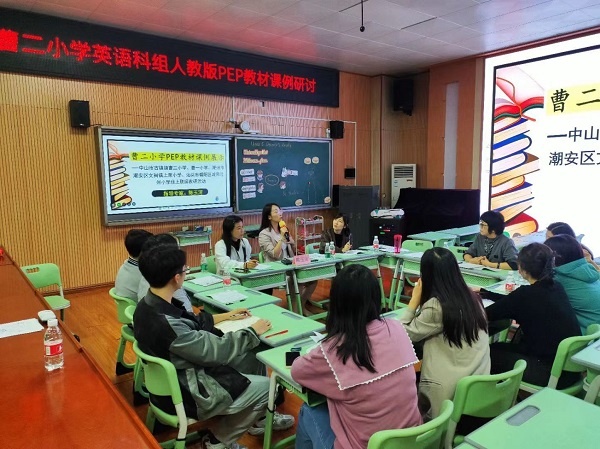 本次活动邀请到中山市实验小学英语科组长陈玉河老师参加,曹二小学麦彩英副校长以及曹二小学、曹一小学全体英语老师参与了本次教研活动,上荣小学的老师则通过线上直播的形式参与。