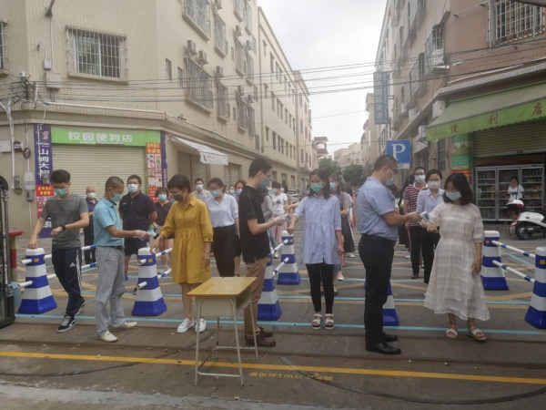 接着进行新冠肺炎疫情应急处置演练。情景一:学生在家长的陪同下来到校门口,学生听从保安和值日老师指挥,保持1米距离排队进校,体温正常进入校园。情景二:发现一学生体温高于37.3°C,并有咳嗽等症状。值日老师把学生立刻带到隔离观察室进一步测量体温,了解近期活动轨迹,学校应急小组马上启动应急预案。情景三:上课时,发现有同学呕吐。上课老师马上紧急组织学生撤离课室。处理过程:1.询问情况,有无疫区接触史。2.二次测体温。3.电话通知家长到校。4.做好登记上报工作。5.家长接小孩回家,去医院做进一步检查。古三小学卫生健康副校长蔡燕颜医生对如何处理这些突发事件做了更加细致的指导和说明。