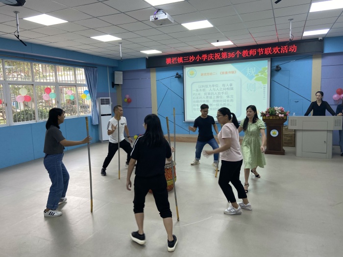 最后,大家以科组为单位,进行了《听歌识曲》《协作奋进》《能量传输》等游戏。在《听歌识曲》中,通常都是一首歌的前奏刚响起,没一会儿就有老师听出了是什么歌曲,马上抢先一步,上前抓起鼓槌,敲响木鼓,大声说出歌名。猜对的老师非常开心,旁观的老师们也兴致勃勃,鼓掌喝彩。在《协作奋进》《能量传输》两个考验集体力量的游戏项目中,大家在开心参与游戏的同时,也体会到团结一致才能取得胜利。