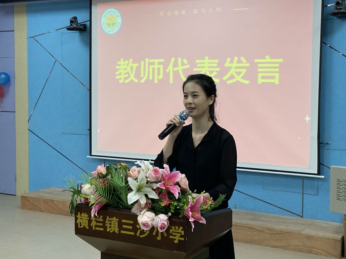 随后,三沙小学冯红燕校长上台致辞。冯校长在致辞中代表学校祝全体教师节日快乐,向在百忙中亲临学校送来节日问候的领导们表示热烈的欢迎和衷心的感谢,向一直以来对学校工作鼎力支持的三沙村委表示感谢,并要求三沙小学全体教师要认真按镇党委冯金怡书记的嘱托,努力在以下几个方面做得更好:要坚守教师的道德与情操,做学生美好灵魂的塑造者;要胸怀教育的责任与追求,做传道授业解惑的引路人;要钻研教学的理念和方法,做改革发展创新的践行者。