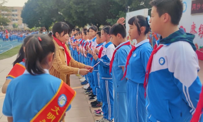 最后,大队辅导员梁佩珊宣布:四沙小学2022年“学雷锋 扬雅风 践雅行”学雷锋活动月正式启动。在大队辅导员的带领下,队员们在国旗下宣誓:“学习雷锋,从我做起,从现在做起,从身边的每一件小事做起,以实际行动诠释雷锋精神!”整齐响亮的宣誓声在校园上空回荡。