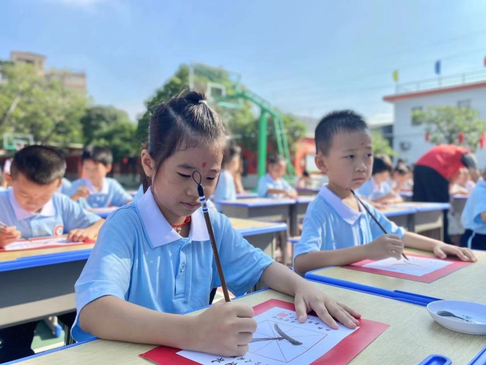 老师们手捧朱砂提到孩子们前面,在他们的额头中间点上红印,祝福他们从此眼亮心明!刘三虎老师和吴花朋两位书法老师,手握毛笔在宣纸上一撇一捺写下“人”字,“人”是一个笔画简单而意义深远的汉字,寓意在人生的启蒙阶段,学会做人是最为重要的。老师教学生执笔,然后在纸上写下一个人字,由学生临摹,表明这一天你开始是真正意义上的一个人。希望孩子们开始读书、写字后能学有所成,做一个对社会有益的人!