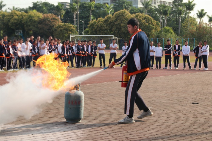 火炬开发区消防救援大队向各班级学生代表进行消防安全知识普及,重点讲解了干粉灭火器使用的操作要领以及注意事项。部分同学还在现场使用干粉灭火器进行了灭火体验。