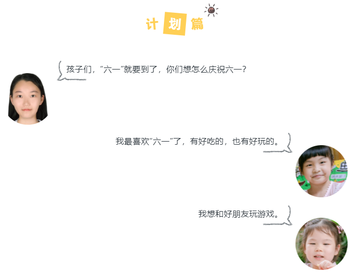 我们对“六一”这一天充满期待和好奇……可是到底怎样过节?和谁一起过节?我们有自己的想法!我们迫不及待地用画笔记录下自己的想法并和小伙伴分享。最后,经过投票,我们选出最期待的游园、大食会和观看电影活动。