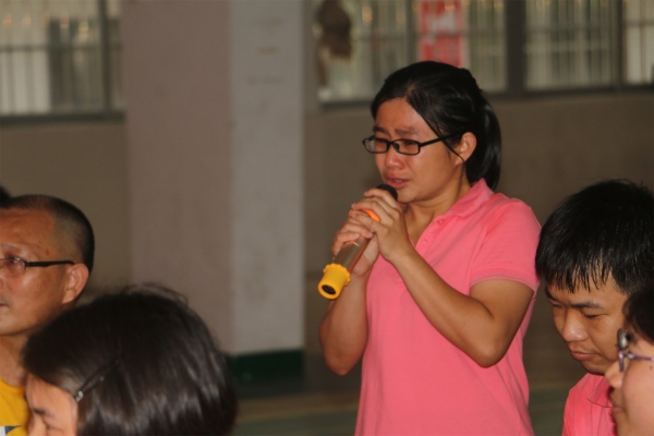 团康活动有3个项目,分别是同心击鼓、赶球竞速和幸福织网。同心击鼓是最具难度的一个项目:一人拉一根绳子,人数少就一人拉两根或三根绳,然后一齐把鼓支撑起来颠球,在3分钟内哪组连续颠球最多的为胜,第一名6分,第二名5分,如此类推。此活动是最考验集体的专注度和配合度的:有的绳子没有拉紧,鼓面下垂,不够张力,球怎么也颠不起来;有的配合度不够;有的还没找到窍门……赶球竞速最有趣:因为是用用一支塑料棒赶着软球跑,塑料棒不好使力,球也不听使唤,笑料百出……