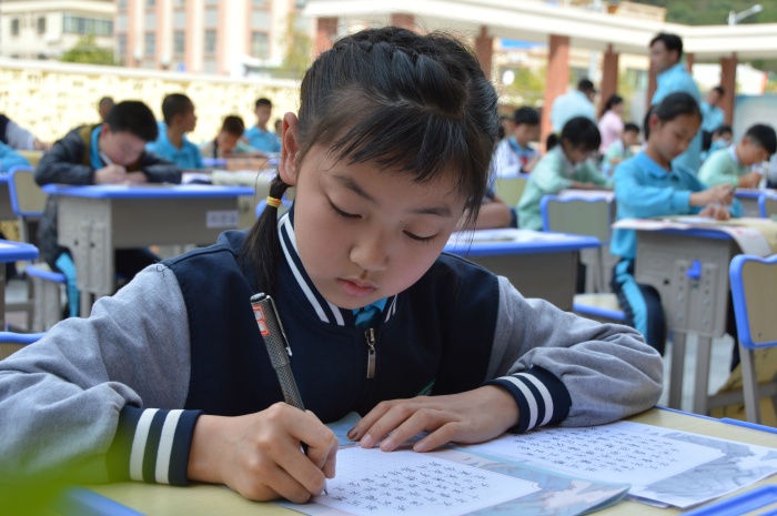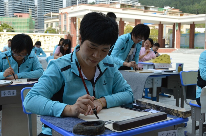 师生们聚精会神执笔书写,全身投入。执笔指实掌虚,运笔中锋铺毫,点画意到笔随,一笔一划,一撇一捺,即成风范。在短短的四十分钟内,一个个美观的汉字从参赛者的笔尖流淌而出,一气呵成。他们有的一笔一划规范书写,用刚正优雅的字迹诠释做人的风骨;有的龙飞凤舞,泼洒飘逸,用精美的笔锋演绎美好的人生。而这游刃有余的背后,是坚持,是揣摩,是磨砺。