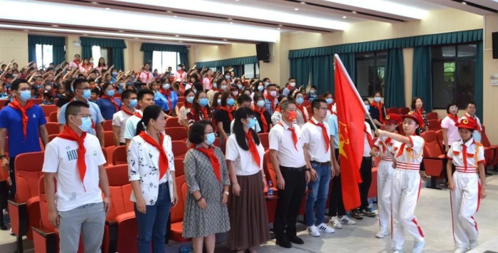 5月31日上午,伴随着庄严的出旗仪式,少先入队仪式由此拉开帷幕。队会上全体队员齐声高唱《少年先锋队队歌》,紧接着由大队长宣读新队员名单。在激励昂扬的队歌中,五年级的老队员为新队员戴上了鲜艳的红领巾。在庄严的队旗下,学校少工委主任李向平向新入队的少先队员们表示热烈的祝贺,同时也表达了对新队员的美好祝愿。他希望少先队员们争做新时代“四有”好少年:有家国情怀的好少年、遵纪守法的好公民、勤奋好学的好学生、有良好品德的好孩子。愿孩子们茁壮成长、愿校园充满欢声笑语、愿祖国的未来更加美好!