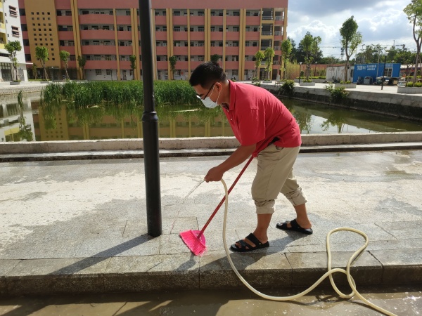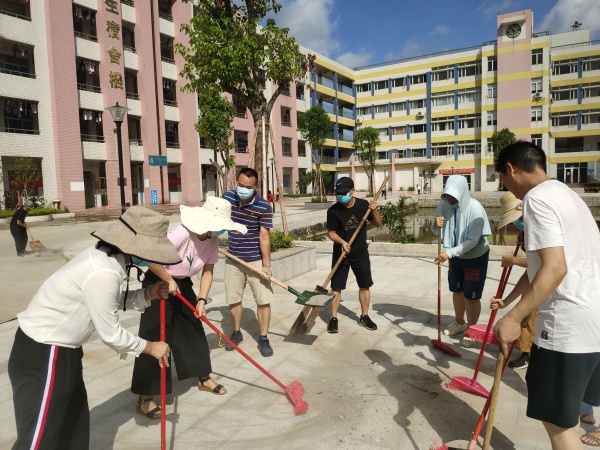 行动中,烈日当空,炙烤着大地,教师们面对校园景观改造工地地面尘土堆积,碎石随处可见,生活垃圾隐匿角落的景象没有就此退缩,反而热情高涨,手拿大扫帚,扛着大铁铲,推着斗车,兴致勃勃地投入到清洁行动中。为了把尘土堆积的地面进行彻底地清洁,有的教师拿着水管来冲刷,有的教师拿着拖把来清理;为了把隐匿在空调主机背后的生活垃圾,卢新泉校长用未戴手套的双手清理垃圾,在卢校长的率先垂范下,几位初一级老师纷纷用手把垃圾清理干净,充分发挥了不怕累、不怕脏的精神;他们如此认真地清洁,如此勤恳地付出,是因为把学校当做家呀!即便是挥汗如雨,依旧义无反顾,教师们的行动保证了校园各个角落干净整洁。