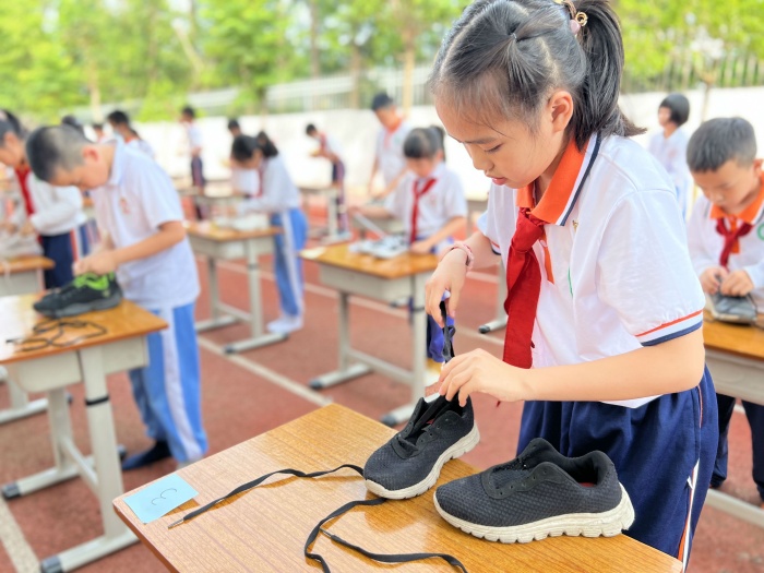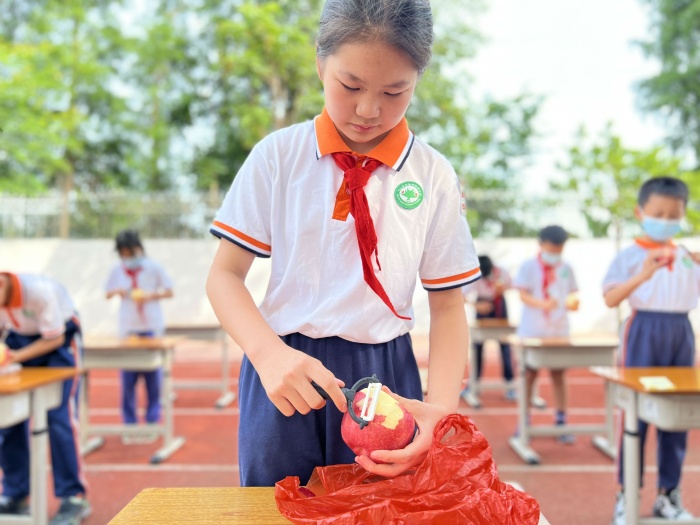 系鞋带是孩子们每天都要做的事。比赛过程中,同学们熟练地穿起了鞋带,接着,同学们抓起鞋带两端,交叉、打结、绑紧,动作迅速又灵活。在一双双巧手的牵引下,细长的鞋带化为了一只只美丽的蝴蝶结。四年级的同学们低着头认真地削着苹果,他们一边握着水果刨,一边转动着手中的苹果,薄薄的苹果皮一圈圈地掉下。削完后,每个同学都展示着削得干干净净的苹果,咬一口,分外香甜。