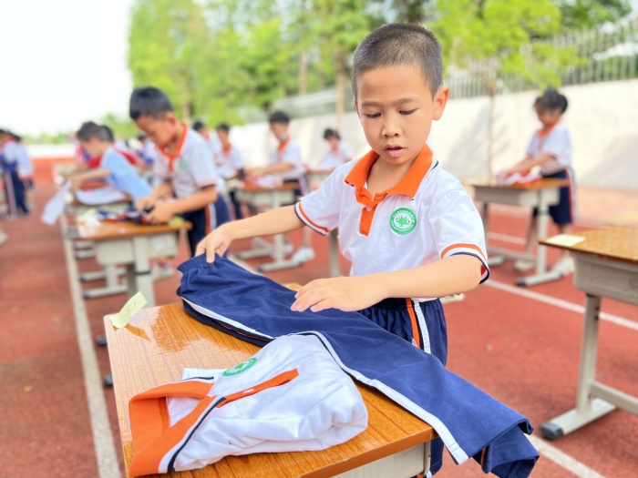 一年级进行的是叠衣服比赛,同学们虽然年纪小,但是叠起衣服来可是有模有样。孩子们全力以赴,快速、整齐、高质量地完成比赛任务,争先恐后地举起自己的小手示意已经完成比赛。二年级进行的是穿衣服、佩戴红领巾比赛。同学们动作迅速,手法娴熟,衣服和红领巾穿戴得又快又美观!