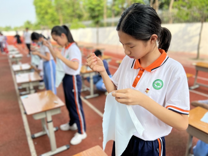 比赛一声令下,五年级的同学们撸起袖子,弯下腰,忙碌起来……他们先将衣服浸湿,在衣领、袖口等特别脏的部分涂上洗衣粉,用力搓洗。揉搓,拧干,用清水漂洗……同学们训练有素,动作娴熟,洗刷漂晒,一气呵成。六年级的同学们小心翼翼地穿针引线,全神贯注地缝制着。银针穿梭,彩线翻飞,小手轻巧地将一颗颗纽扣牢牢钉在布片上。