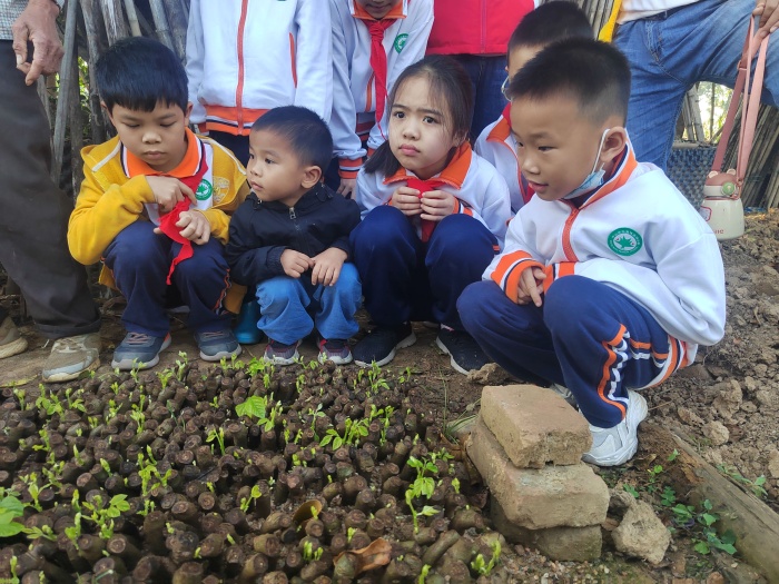 阡陌纵横间,同学们在沙栏村粉葛种植基地梁德有伯伯的带领下第一次看到了粉葛苗,一棵棵嫩绿的粉葛苗整齐地排列在眼前。有的同学瞪着大大的眼睛去观察粉葛苗并记录生长情况,还有的同学积极向梁伯伯询问粉葛的生长周期、育苗要领等,感受粉葛生命的力量。