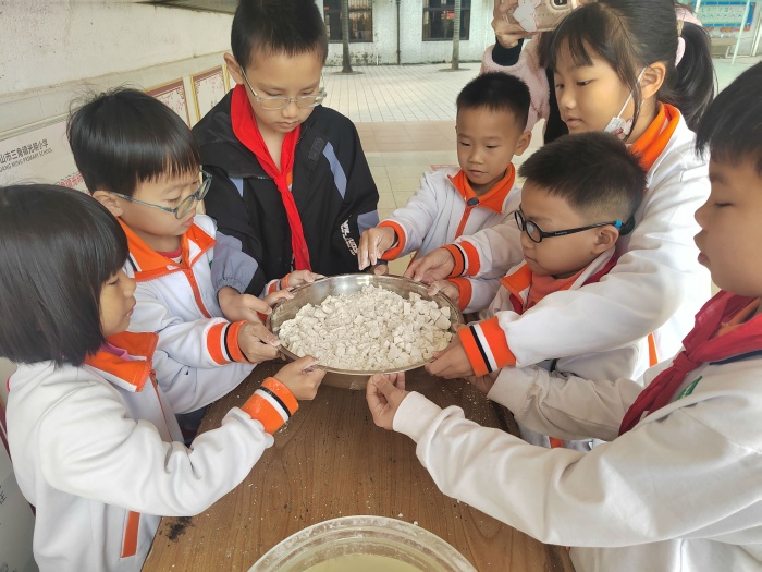 粉葛是大自然中一个名副其实的宝,具有消暑、解热、清毒等特点。活动最后,同学与家长们以互动合作的形式将新鲜挖出的粉葛制作成细腻清香的葛粉。挖粉葛、洗粉葛、切块根、磨浆滤水、晒葛粉,同学们用汗水浇灌出丰收的快乐,不仅收获了一碗香甜的葛粉鸡蛋糖水,更懂得了“一蔬一饭当思来之不易”的道理。