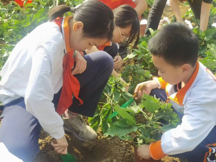 上午九点半,三角小学的孩子们佩戴鲜艳的红领巾,家长们身穿志愿者马甲和带队行政、老师们一起抵达三角文化广场。活动伊始,由三角小学陈见洪校长讲解本次活动的意义和注意事项。紧接着,三角小学亲子义工服务队在党员志愿者的带领下有序地进行分组,经过学校德育处吴主任以及劳动基地负责人的简单讲解后,大家纷纷有序地领取植树工具与向日葵花苗,当起了“园艺工程师”。亲子义工们拿起工具,分工合作,挖坑、扶苗、培土、浇水,每个环节衔接有序、有条不紊,植树现场一片热火朝天。