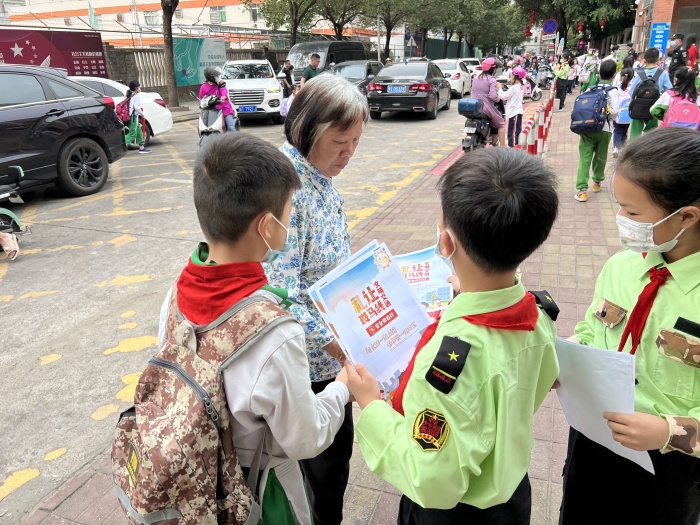 朝阳迎面照来,三角镇中心小学的少年军们精神抖擞地在校门口开展交通安全宣传活动。在交通繁忙的上学路段,他们拿着交通安全宣传单,热情地向学生、家长讲解交通安全知识,纷纷得到了学生、家长的赞同。家长们也表示,必定会遵守交通规则,安全文明出行。