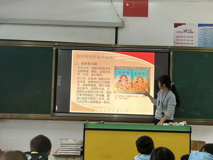 加强宣传,提高意识。学校利用校门口电子屏显示“坚持扫黄打非 保护知识产权”、“远离有害出版物 自觉抵制文化垃圾”等宣传标语,提高师生及家长抵制非法出版物及有害信息的意识。开展主题班会,推行绿色阅读。各班开展了“扫黄打非,绿色阅读”主题班会,引导学生正确认识盗版书籍的危害,自觉抵制盗版书籍;坚持购买、使用正版书籍,多读书,读好书;自觉抵制网络上腐朽、不健康的内容对精神上的侵蚀。清查盗版书籍,净化校园文化环境。班会课后,各班主任带领同学们一起检查了班级图书角的图书,清查盗版书籍,用实际行动支持和落实“扫黄打非”进校园的工作,净化校园文化环境。